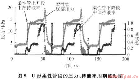 圖5是氣、液相折算速度都為0.30m/s時(shí)U形柔性管的壓力、持液率周期波動(dòng)圖。在液塞形成階段液塞頭進(jìn)入U(xiǎn)形柔性管之前,U形柔性管內(nèi)少量液體振蕩流動(dòng),U形柔性管底部壓力較小并有小幅度的波動(dòng)。液塞進(jìn)入U(xiǎn)形柔性管后,U形柔性管下降段中部持液率先開(kāi)始上升,由于下降段傾角較大,液體在下降段為分層流,U形柔性管下降段中部持液率值較小。隨著液塞頭在上升段中生長(zhǎng),U形柔性管底部壓力開(kāi)始增大,當(dāng)?shù)竭_(dá)上升管探針處時(shí),U形柔性管上升段中部持液率從0變?yōu)?。在液塞生產(chǎn)階段,U形柔性管底部壓力與U形柔性管上升段中部持液率不再增長(zhǎng)。隨著液塞不斷流入U(xiǎn)形柔性管,U形柔性管上升段中部持液率慢慢增大。在液氣噴發(fā)階段,由于液塞加速,U形柔性管底部壓力先迅速增大然后迅速減小到最小值,U形柔性管上升段中部持液率迅速增大到1。隨著液塞尾經(jīng)過(guò)U形柔性管,液體回落,U形柔性管上升段中部持液率和u形柔性管上升段中部持液率迅速減小直至重新變?yōu)?,開(kāi)始下一個(gè)嚴(yán)重段塞流周期。
