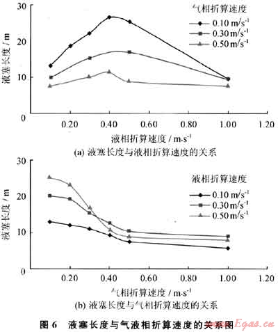 液塞長(zhǎng)度隨著氣相折算速度的增加而減小。當(dāng)液相折算速度恒定時(shí),隨著氣相折算速度的增加,嚴(yán)重段塞流周期變小,流入立管的液體減少,因而液塞長(zhǎng)度減小。同樣,圖2所示的流型圖也反應(yīng)了這種現(xiàn)象。