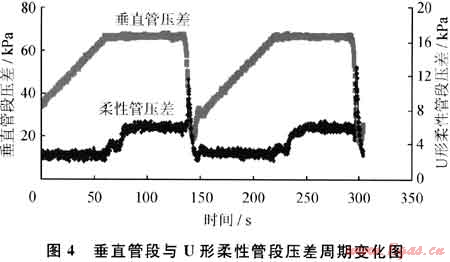 圖4是氣液相折算速度都為0.10m/s時(shí)U形柔性管段壓差和垂直管段壓差周期波動(dòng)圖。由圖4可知,液塞在垂直管段生長(zhǎng)時(shí),垂直管段壓差逐漸增大,U形柔性管段壓差很小而且穩(wěn)定;液塞到達(dá)垂直管段頂部進(jìn)入U(xiǎn)形柔性管段后垂直管段壓差不變,U形柔性管段壓差開(kāi)始增大,垂直管段壓差要遠(yuǎn)大于U形柔性管段壓差,這主要是由于垂直管段的長(zhǎng)度遠(yuǎn)大于U形柔性管段的凈垂直高度。