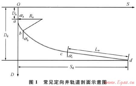 設計井眼軌道通常由4部分組成:oa段——直井段,ab——圓弧過渡段,bc段——特殊曲線井段(圓弧、懸鏈線或擬懸鏈線等),cd段——穩(wěn)斜井段(如圖1所示)。主要參數有:①靶點垂深Dd,水平位移Sd;②oa段:造斜點垂深Da,井斜角αa;③ab段:造斜率Ka或曲率半徑Ra;④cd段:穩(wěn)斜角αc、穩(wěn)斜段長度Lw等[3]。
