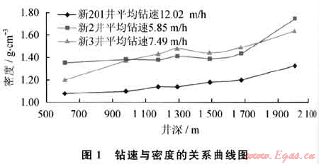 通過理論分析和現(xiàn)場實際所鉆井資料分析可以看出,在同一地質(zhì)條件、同一地層壓力和同一鉆井液類型的前提下,鉆井液密度越高鉆井機械鉆速越低。X201井鉆井液密度最高僅為1.30g/cm3,其鉆井速度最高達到了12.64m/h,如圖1所示。