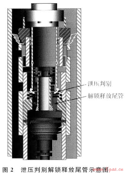 設(shè)計使尾管釋放的控制壓力與開通循環(huán)控制壓力之間保持一定的壓力級差,在實施液壓尾管釋放后保持管內(nèi)壓力不變的狀態(tài)下,采取上提管柱使插入管下端解除密封泄壓、通過井口觀察管內(nèi)壓力顯示是否明顯下降來判斷尾管是否脫掛,得出明顯脫掛結(jié)果后再加壓開通循環(huán)進行注水泥施工。這樣可克服以往懸重判別尾管脫離的操作和判別失誤。