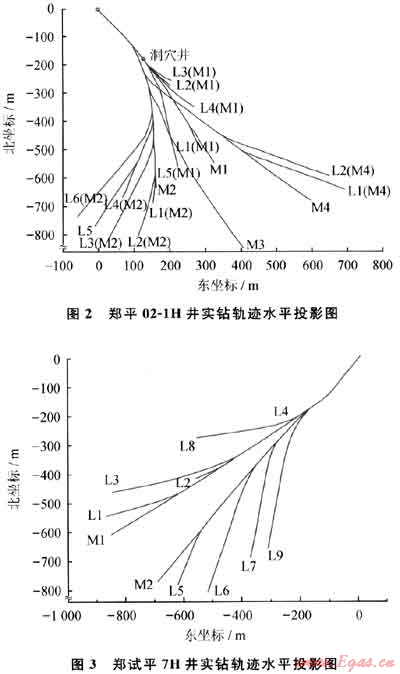 鄭平02-1、鄭平05-1、鄭試平4H和鄭試平7H井是沁水盆地南部斜坡高階煤層氣田鄭莊區(qū)塊上部署的多分支水平井,鉆井過(guò)程中,使用清水作為循環(huán)介質(zhì),并從洞穴直井充氣幫助攜帶巖屑。鄭平02-1H井施工過(guò)程中,曾因煤層垮塌,造成環(huán)空循環(huán)通道堵塞,導(dǎo)致兩次卡鉆事故。L5分支井眼鉆進(jìn)過(guò)程中因井壁垮塌嚴(yán)重、井眼上下交錯(cuò)復(fù)雜,在M1主井眼上已經(jīng)沒(méi)有側(cè)鉆點(diǎn),鉆出的分支又無(wú)法重入。反復(fù)論證后,改變?cè)O(shè)計(jì),在洞穴前面的主井眼側(cè)鉆一個(gè)主分支,在該主分支上繼續(xù)側(cè)鉆分支井(圖2)。鄭平05-1H井在施工過(guò)程中發(fā)生卡鉆事故2起,損失時(shí)間419h,占總時(shí)間的16.51%;第二次卡鉆事故解除后,因821~894m井段煤層垮塌嚴(yán)重,井下情況復(fù)雜,被迫在760m開(kāi)窗側(cè)鉆。
