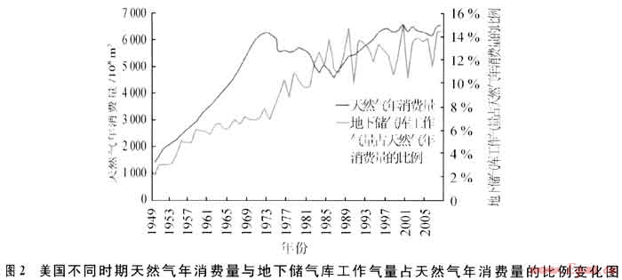 7) 市場對地下儲氣庫工作氣量需求會隨天然氣消費(fèi)增長而持續(xù)增長,由于地下儲氣庫建設(shè)周期長,工作氣量的建設(shè)高峰期往往滯后于天然氣消費(fèi)量高峰期。以美國為例,天然氣消費(fèi)高峰期為1973年,天然氣年消費(fèi)量達(dá)6000×108m3,但同期地下儲氣庫工作氣量僅200×108m3,不到天然氣年消費(fèi)量的6%。但到了1990年前后,地下儲氣庫工作氣量就達(dá)到了1200×108m3左右,占天然氣年總消費(fèi)量的15%。美國不同時期天然氣年消費(fèi)量與地下儲氣庫工作氣量占天然氣年消費(fèi)量的比例變化情況如圖2所示。